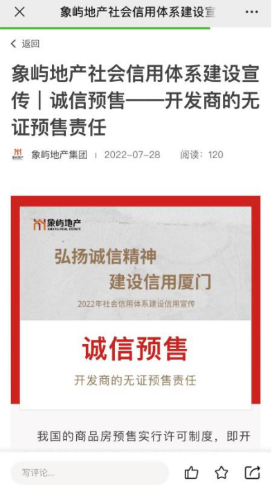 象嶼地產(chǎn)以報(bào)道誠(chéng)信企業(yè)案例、倡導(dǎo)高品質(zhì)產(chǎn)品和服務(wù),弘揚(yáng)全社會(huì)誠(chéng)信典型的精神。同時(shí),結(jié)合培育與踐行社會(huì)主義核心價(jià)值觀工作,象嶼集團(tuán)不定期通過(guò)微社區(qū)發(fā)布誠(chéng)信典型事跡,褒揚(yáng)誠(chéng)實(shí)守信的先進(jìn)典型:象嶼創(chuàng)投組織員工進(jìn)行《廈門(mén)市社會(huì)信用體系建設(shè)2022年工作要點(diǎn)》自行學(xué)習(xí)及廉潔從業(yè)書(shū)籍閱讀,提升員工對(duì)信用體系建設(shè)的理解;象嶼興泓公司組織先進(jìn)分享業(yè)務(wù)及安全骨干心路分享活動(dòng),銷(xiāo)售副總對(duì)各業(yè)務(wù)部門(mén)業(yè)務(wù)開(kāi)展情況進(jìn)行點(diǎn)評(píng),展現(xiàn)了象嶼集團(tuán)引導(dǎo)廣大職工學(xué)習(xí)先進(jìn),發(fā)揮先進(jìn)的示范引領(lǐng)帶動(dòng)作用,為廈門(mén)這座全國(guó)文明典范城市創(chuàng)建助跑添力。