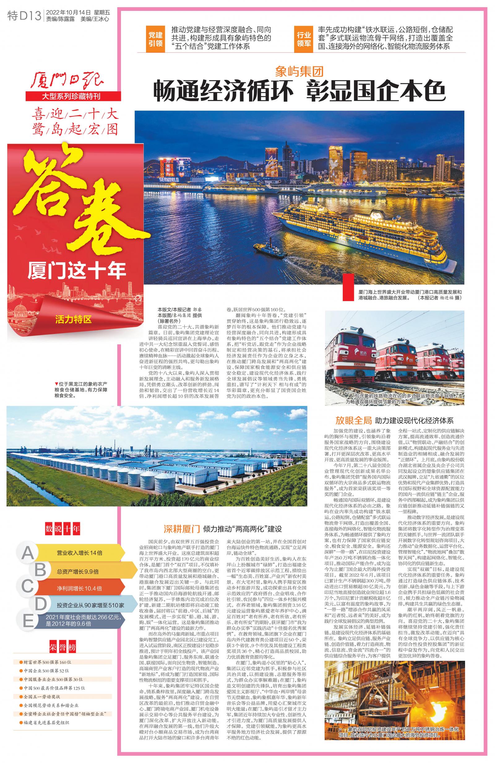 編者按:這10年,我們始終沿著習(xí)近平總書記指引的方向奮勇向前;這10年,我們奮力書寫高質(zhì)量發(fā)展亮麗答卷。今天,廈門日報推出大型系列特刊《喜迎二十大 鷺島起宏圖 答卷·廈門這十年》,專版報道象嶼集團(tuán)堅持黨建引領(lǐng),深耕廈門傾力推動“兩高兩化”建設(shè),放眼全局助力建設(shè)現(xiàn)代化經(jīng)濟(jì)體系的精彩答卷?,F(xiàn)全文轉(zhuǎn)載如下。