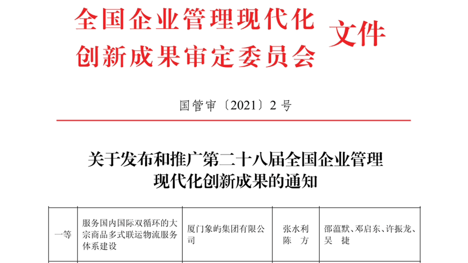 2022年,第二十八屆全國(guó)企業(yè)管理現(xiàn)代化創(chuàng)新成果名單發(fā)布,象嶼集團(tuán)憑借《服務(wù)國(guó)內(nèi)國(guó)際雙循環(huán)的大宗商品多式聯(lián)運(yùn)物流服務(wù)》榮獲一等獎(jiǎng),成為廈門(mén)首家獲評(píng)該獎(jiǎng)項(xiàng)一等獎(jiǎng)的企業(yè)。11月,倫敦設(shè)計(jì)獎(jiǎng)(London Design Awards)結(jié)果出爐,上海天安象嶼西江悅榮獲建筑設(shè)計(jì)類(lèi)別最高獎(jiǎng)金獎(jiǎng),福州象嶼國(guó)貿(mào)星璟原獲展示空間銀獎(jiǎng)。此外,2020-2021年度全國(guó)企業(yè)文化優(yōu)秀成果一等獎(jiǎng)、2022金蜜蜂企業(yè)社會(huì)責(zé)任·中國(guó)榜“ESG競(jìng)爭(zhēng)力·責(zé)任采購(gòu)”獎(jiǎng)、福建五一勞動(dòng)獎(jiǎng)狀、福建省優(yōu)秀企業(yè)家等重磅獎(jiǎng)項(xiàng)也先后花落象嶼,凸顯社會(huì)對(duì)象嶼的高度認(rèn)可。