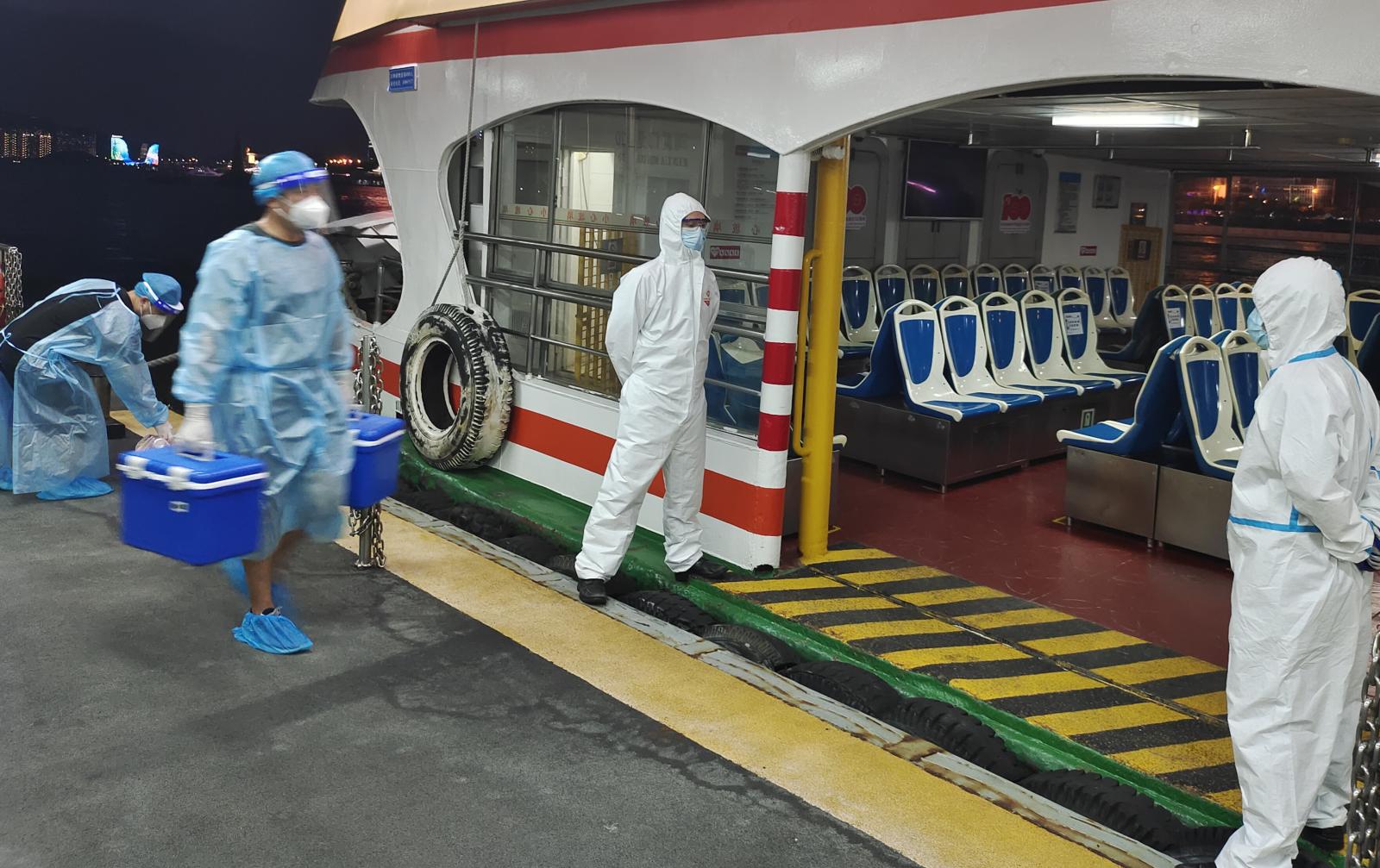 在疫情防控中,廈門輪渡公司還成立黨員突擊隊(duì),調(diào)派“全國青年文明號(hào)”——“輪渡20”船作為發(fā)熱病人轉(zhuǎn)運(yùn)專船,日夜守護(hù)人民群眾健康安全。轉(zhuǎn)運(yùn)任務(wù)時(shí)常緊急且繁重,半夜出動(dòng)也是家常便飯。但每當(dāng)任務(wù)來臨,他們總是毫無怨言,盡職盡責(zé)暢通“生命轉(zhuǎn)運(yùn)線”,當(dāng)好人民群眾的“守夜人”。每每完成運(yùn)送任務(wù)后,他們還要拖著疲憊的身軀,做好碼頭船岸的消殺工作。據(jù)統(tǒng)計(jì),僅2022年期間,專船就轉(zhuǎn)運(yùn)發(fā)熱病人 236趟次、中高風(fēng)險(xiǎn)地區(qū)人員195趟次、核酸樣本589趟次。