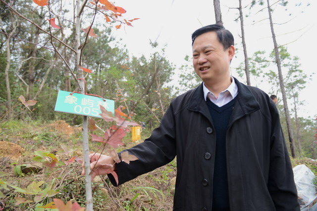 象嶼集團(tuán)黨委副書記邵蕰默為去年種下的喬木楓樹掛上號碼牌。