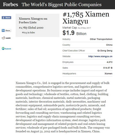 5月25日,美國(guó)《福布斯》發(fā)布2017年“全球上市公司2000強(qiáng)”排行榜(Forbes Global 2000),中國(guó)(含港澳臺(tái)地區(qū))共有309家公司登榜。象嶼集團(tuán)旗下上市公司象嶼股份(SH600057)首次進(jìn)入該榜單,位列第1785位,這標(biāo)志著全球化進(jìn)程中的象嶼股份進(jìn)入了全球資本市場(chǎng)的關(guān)注視野。