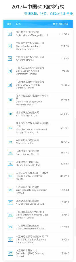 7月31日,《財富》(中文版)發(fā)布了2017年“中國500強(qiáng)”排行榜,象嶼股份位列57位,較上一年度前進(jìn)41位。在同時發(fā)布的行業(yè)榜單中,象嶼股份位列交通運(yùn)輸、物流、倉儲業(yè)行業(yè)子榜單第1位。
