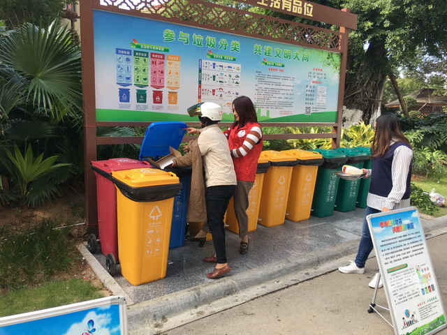 ▲廈門新為天企業(yè)管理有限公司象嶼分公司組織員工利用周末、晚上等時間在社區(qū)垃圾收集點做志愿督導員,用行動倡議垃圾分類。