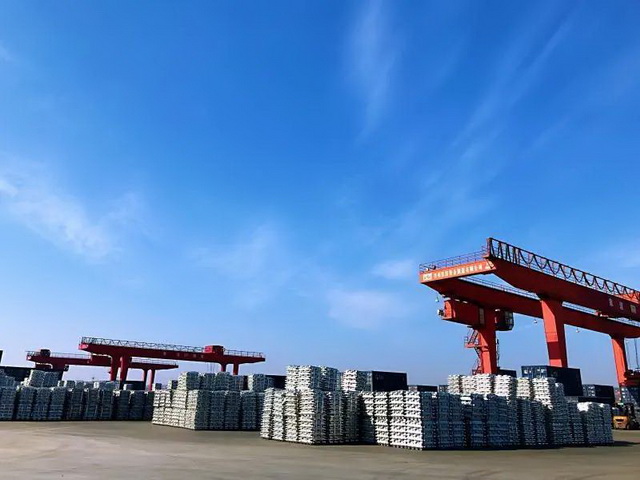 在河南鞏義象道物流園區(qū),來自新疆準(zhǔn)東、石河子的鋁錠碼放得整整齊齊。