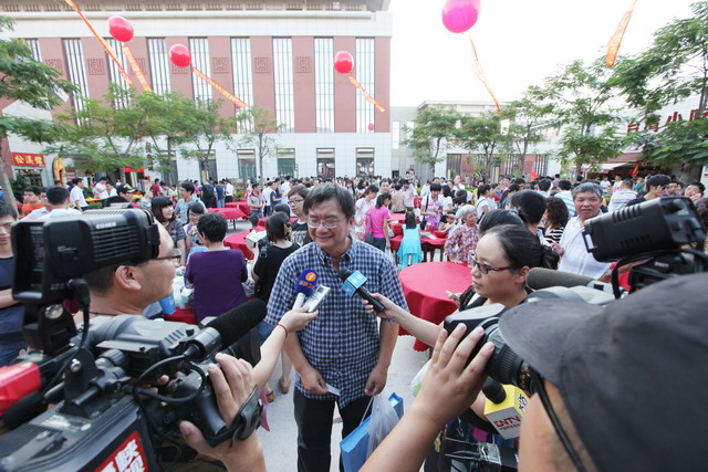 入駐大嶝小鎮(zhèn)的臺(tái)商接受兩岸媒體采訪