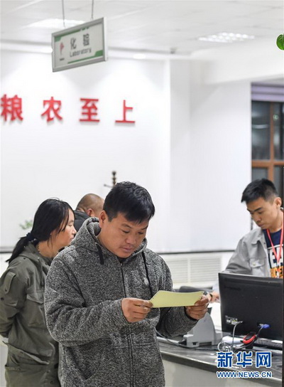 在黑龍江北安市的北安象嶼金谷農(nóng)產(chǎn)有限責任公司,一位糧農(nóng)在查看糧食化驗結果