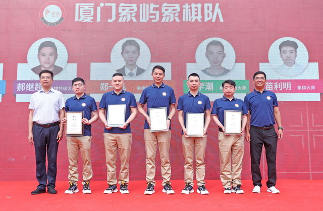 市總工會黨組書記、常務(wù)副主席許毅青和象嶼集團(tuán)黨委書記、董事長張水利為象棋特級大師鄭一泓、張學(xué)潮、郝繼超和象棋大師陳泓盛、苗利明等5名廈門象嶼象棋隊(duì)隊(duì)員頒發(fā)聘書,廈門象嶼象棋隊(duì)接過市體育局黨組書記、局長阮敦梁授予的出征旗,本月,他們將代表廈門出征全國象棋甲級聯(lián)賽。