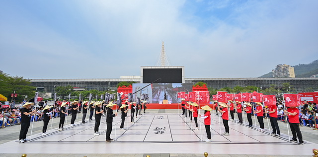 以天為蓋,以地為棋盤,32位頭戴斗笠、手舉刀旗的志愿者正身臨“棋”境,搭配武俠風(fēng)背景樂,在五一文化廣場上行走廝殺,指揮他們的是象棋特級大師郝繼超、張學(xué)潮。