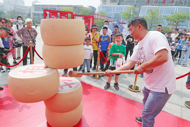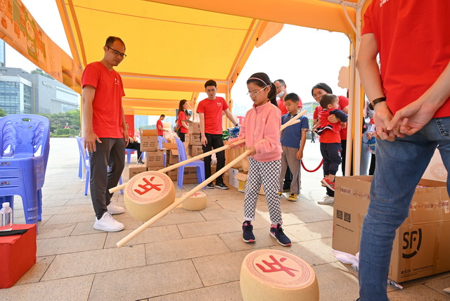 在象棋大擺錘游戲區(qū)前,只要敲擊掉5顆大象棋中間的1顆,并保證其他棋子不倒,便能闖關(guān)成功。只見大小朋友們輪番上陣,掄起大擺錘使勁敲擊,有人使出洪荒之力,不慎將象棋全部打翻;有人精準(zhǔn)打擊卻用力不足,象棋巋然不動……幾回合下來,大家終于掌握了制勝法寶——精準(zhǔn)施力。歡笑聲在各大游戲互動區(qū)洋溢,不少闖關(guān)成功的市民,手捧精美禮品,滿載而歸。