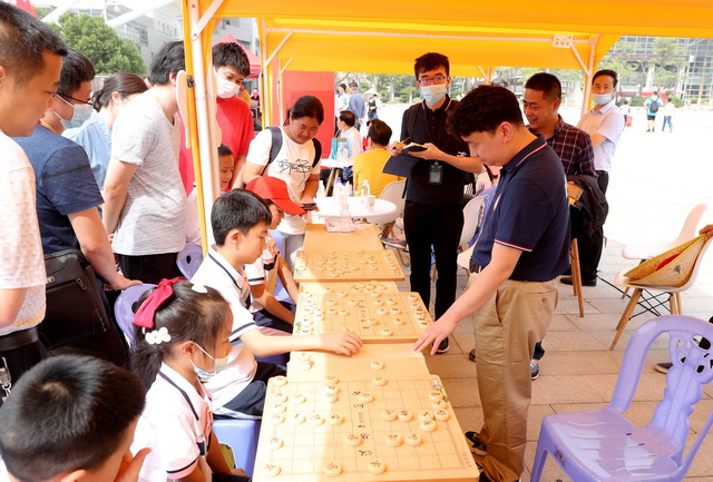 象棋大擺錘、象棋轉(zhuǎn)移挑戰(zhàn)、默背象棋挑戰(zhàn)、滑棋大挑戰(zhàn)、笑口常開等以象棋為主題的游戲互動區(qū),人頭攢動、熱鬧非凡。