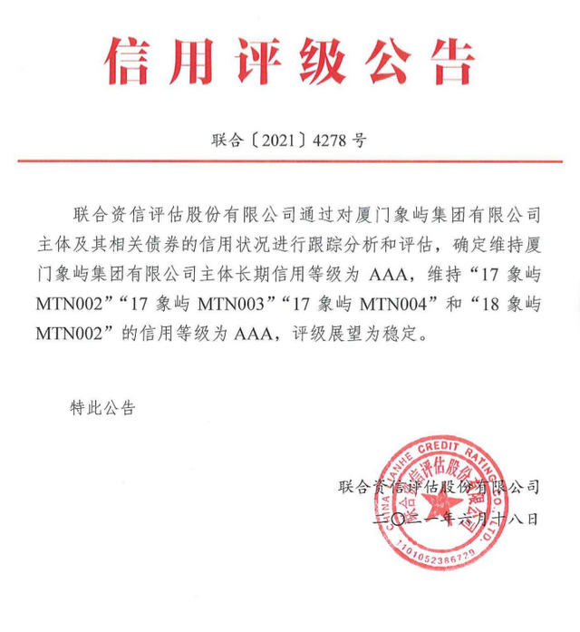 6月21日,國內(nèi)權(quán)威評級機構(gòu)聯(lián)合資信評估股份有限公司(以下簡稱“聯(lián)合資信”)發(fā)布廈門象嶼集團有限公司(以下簡稱“象嶼集團”)2021年跟蹤評級報告,確定維持象嶼集團主體長期信用等級和公司債券信用等級為AAA,評級展望為穩(wěn)定。