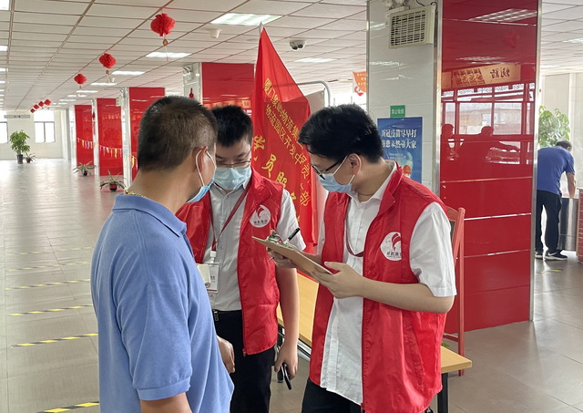 象嶼集團(tuán)黨員志愿者做好人員測溫、登記,在食堂開展督導(dǎo),引導(dǎo)錯位就餐。