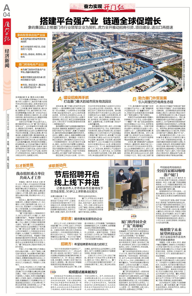 近年來,廈門跨境電商產(chǎn)業(yè)園堅(jiān)持頂層設(shè)計(jì)、圈層構(gòu)筑、鏈條打造三位一體,成功吸引亞馬遜全球開店項(xiàng)目、Shopee跨境電商孵化中心,新引入阿里巴巴電商生態(tài)鏈,招商運(yùn)營再次取得新突破,累計(jì)注冊(cè)企業(yè)達(dá)825家,招商引資超37億元。園區(qū)入選工信部“國家小微雙創(chuàng)示范基地”和商務(wù)部“國家電子商務(wù)示范基地”,形成雙國家基地支撐格局。去年圍繞服務(wù)金磚創(chuàng)新基地建設(shè),園區(qū)引入南非進(jìn)口商品交流中心、俄羅斯商品展示中心等,打造金磚國家跨境電商綜合服務(wù)中心。同時(shí),象嶼集團(tuán)的海外業(yè)務(wù)布局及在金屬礦產(chǎn)、能源化工、農(nóng)產(chǎn)品等傳統(tǒng)優(yōu)勢(shì)領(lǐng)域和新能源等新興板塊的持續(xù)發(fā)力,也帶動(dòng)集團(tuán)在廈進(jìn)出口、批發(fā)零售等指標(biāo)強(qiáng)勁增長?;⒛暌潦迹髱Z股份船舶事業(yè)部就迎來6艘散貨船出口訂造訂單,并順利交付國外客戶2艘船舶,喜迎“開門紅”。
