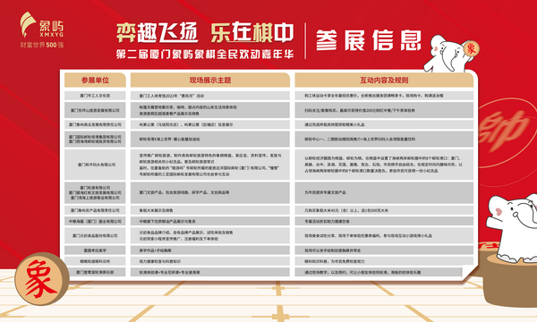 嘉年華現(xiàn)場還設置了象棋主題文化展區(qū),包括當代象棋大師臉譜及象棋文化展、廈門象嶼象棋隊精彩回顧及象嶼品牌、公益主題展等,通過豐富的圖文資料,帶您回顧廈門象嶼象棋隊的精彩瞬間,展示出征象甲“新班底”。