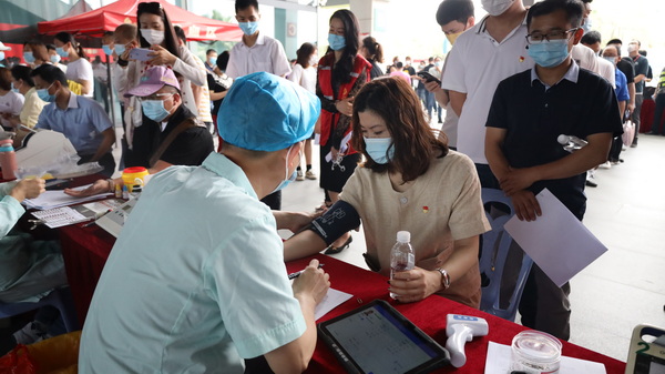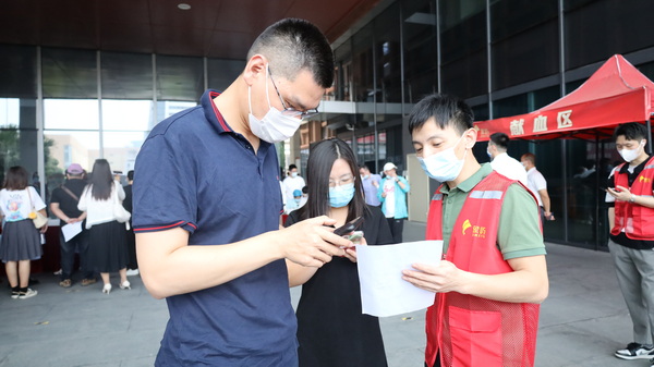 為在疫情常態(tài)化管控背景下保障活動順利進(jìn)行,“紅馬甲”也成為昨天現(xiàn)場的另一道風(fēng)景。來自主辦單位的志愿者們?yōu)楂I(xiàn)血者搭起遮陽棚,并引導(dǎo)他們戴好口罩、保持間距、有序排隊。象嶼集團(tuán)還為獻(xiàn)血者準(zhǔn)備了堅果、花生牛奶等營養(yǎng)補(bǔ)給以及感恩禮包。